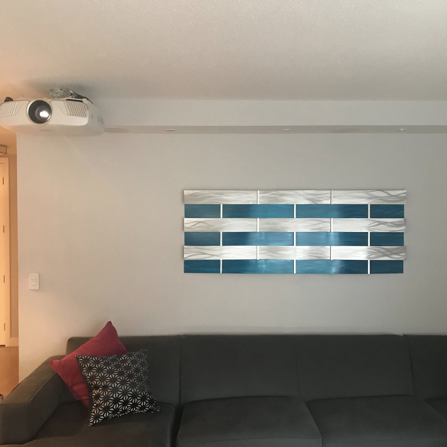 White projector blends with wall and ceiling to be discreet, but provide a huge image to Screen Innovations Solo Pro screen on other side of the room.