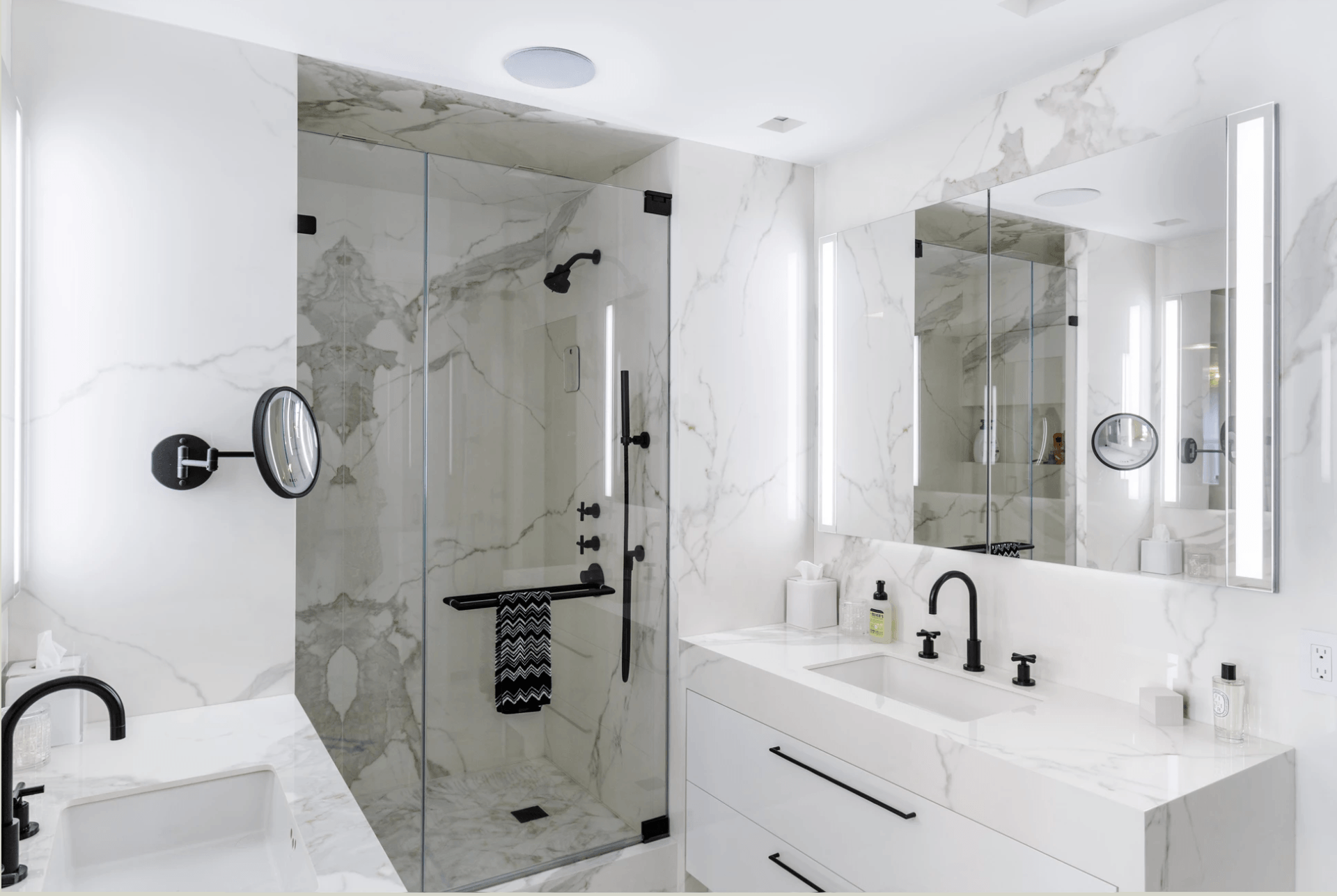Marine grade water resistant bathroom in-ceiling Paradigm speakers for music in every room. Powered by Sonos and Control4