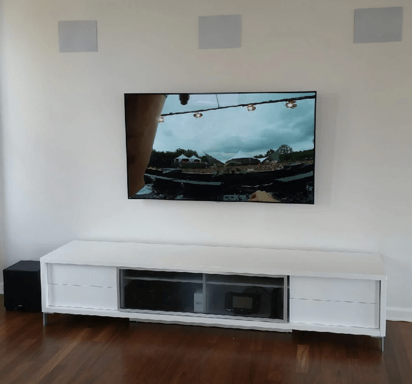Surround sound install with Paradigm speakers and 65" OLED TV.